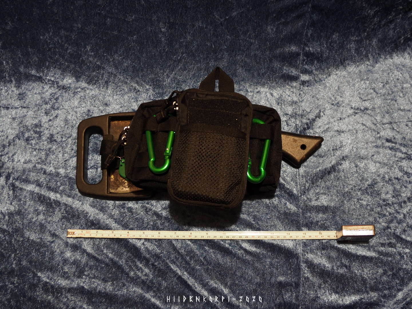 The set contains two tacticool pouches pals strapped together and an axe strapped on the backside pals loops of the other pouch. The axe sheet cover acts as a carrying handle for the whole beauty. Total weight about one kilo.